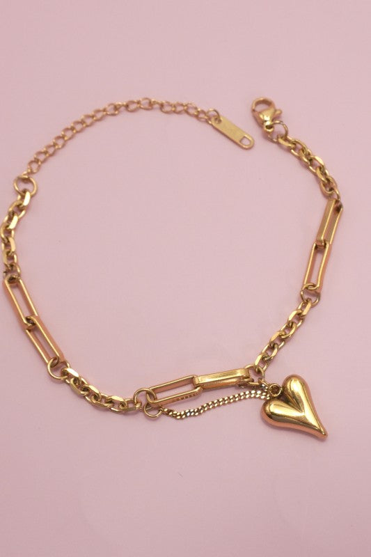 18k Stainless Steel Bracelet features a bold heart charm elegantly suspended on link chain. Tarnish Free. Real Gold Dipped. Hypoallergenic. Water Resistant. Sweat Proof. PVD Coating.