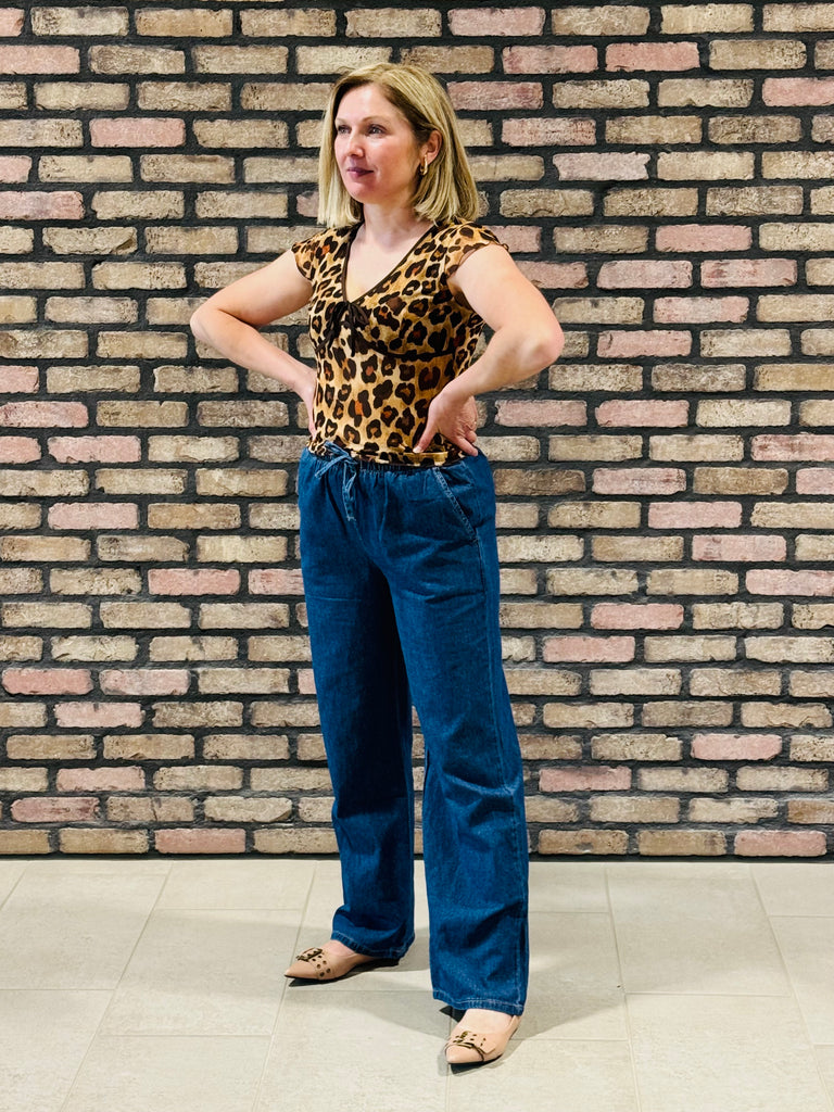 Denim straight pants with elastic waistband, drawstrings and pockets