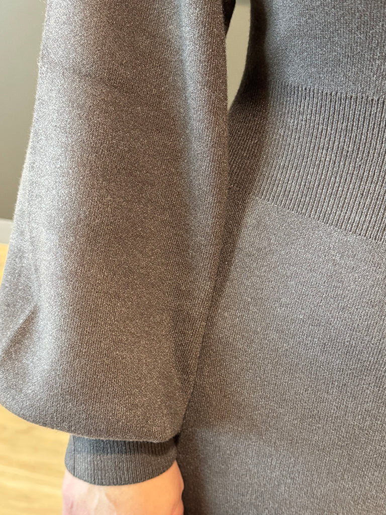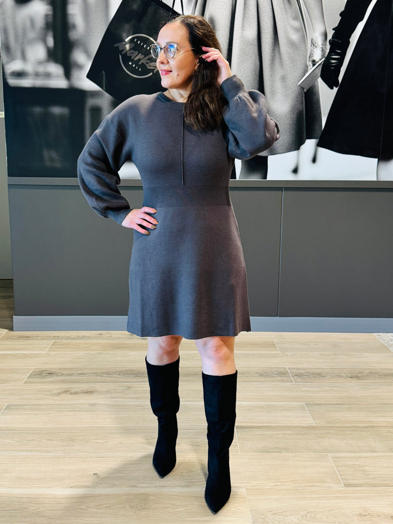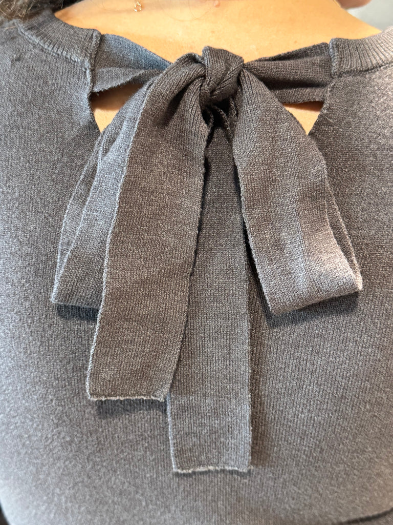 Knit sweater mini dress with front seam detail, back tie and ribbed waist