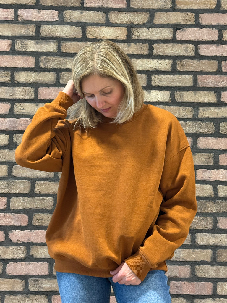 Complete your cozy look with our oversized boyfriend pullover. Perfectly pairs with fleece pants. Made with fleece fabric, featuring a soft brushed inside, timeless styling, and an oversized fit for ultimate comfort.