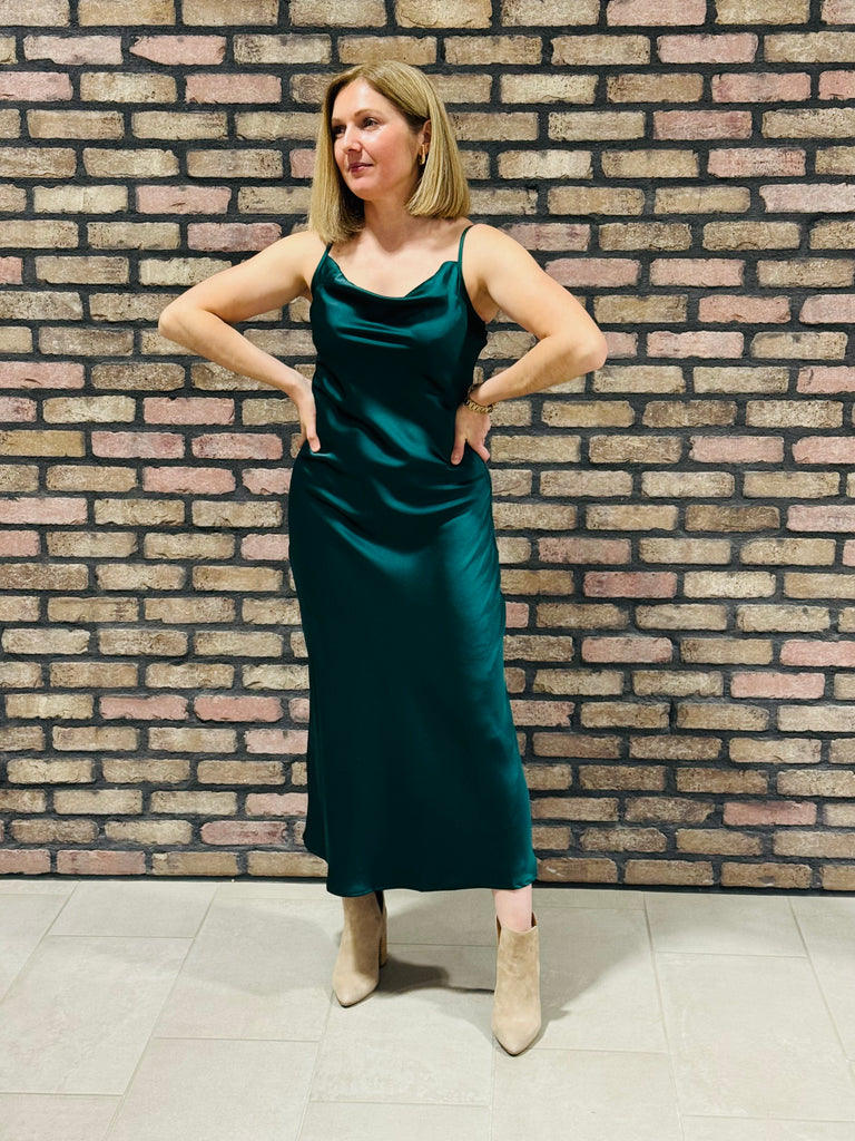Satin sleeveless cowl neck midi dress with adjustable straps