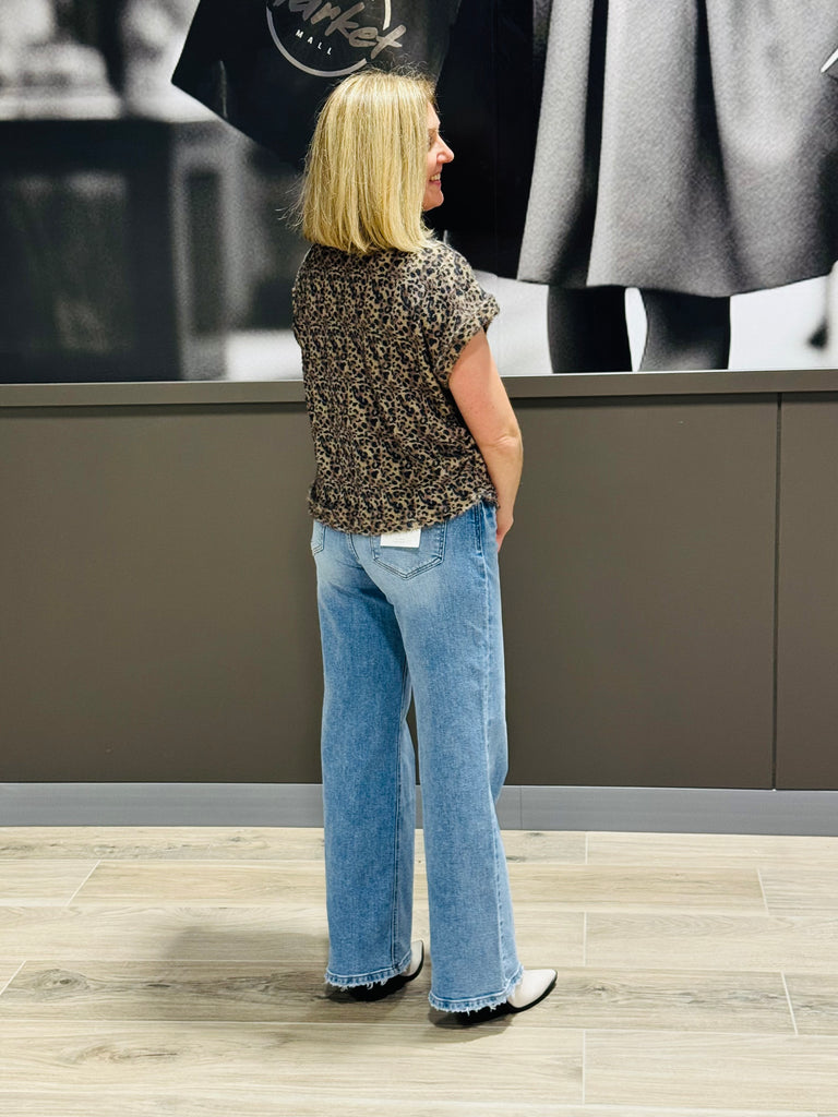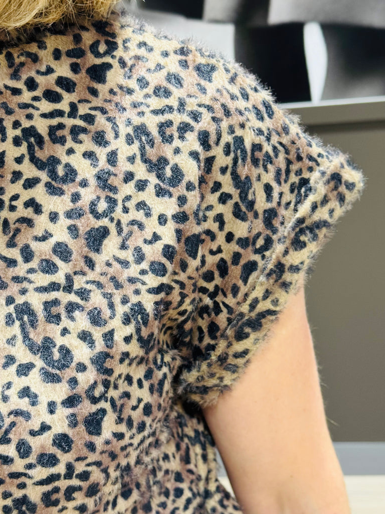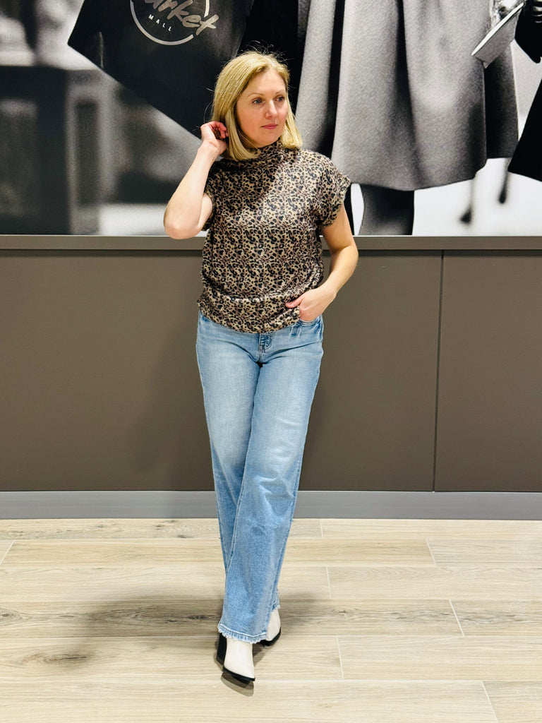Side elastic detail leopard soft knit top with mock neck and short sleeves
