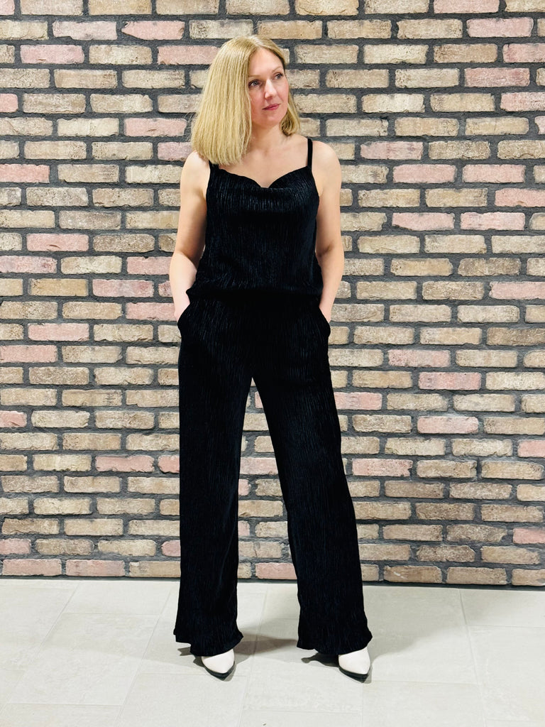Cowl neck top and elastic waistband pants with pockets textured velvet set