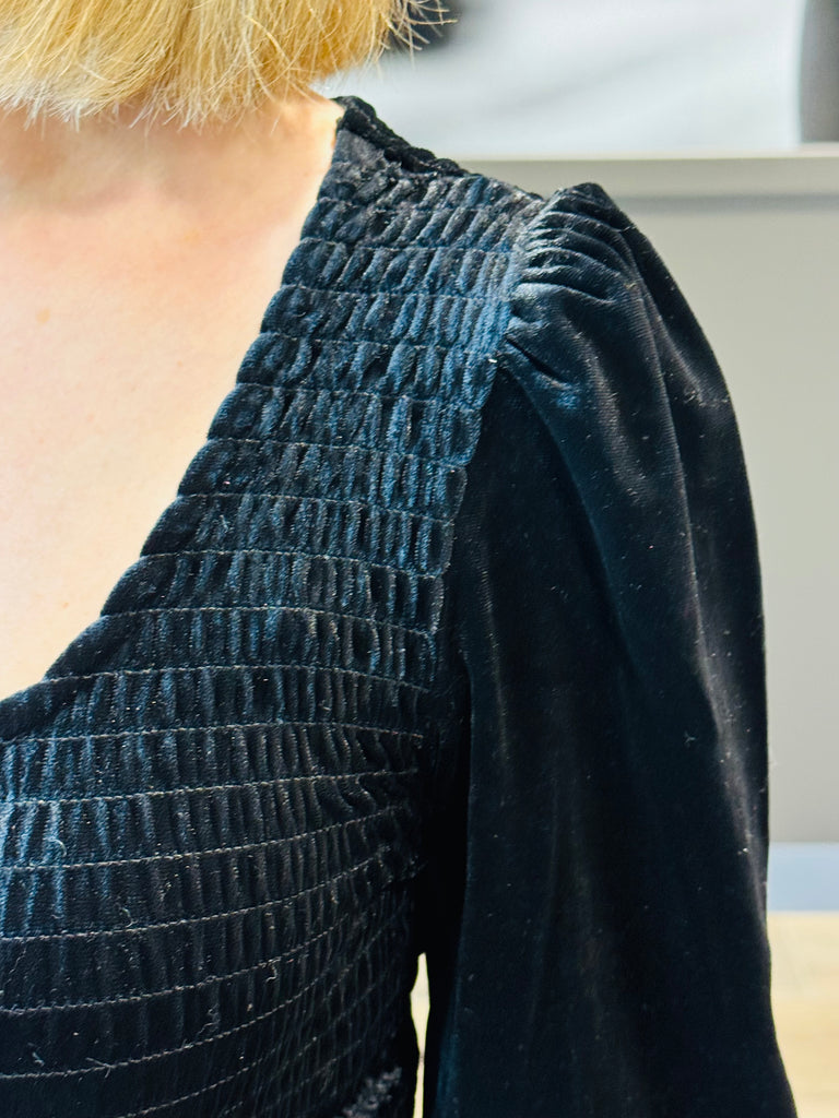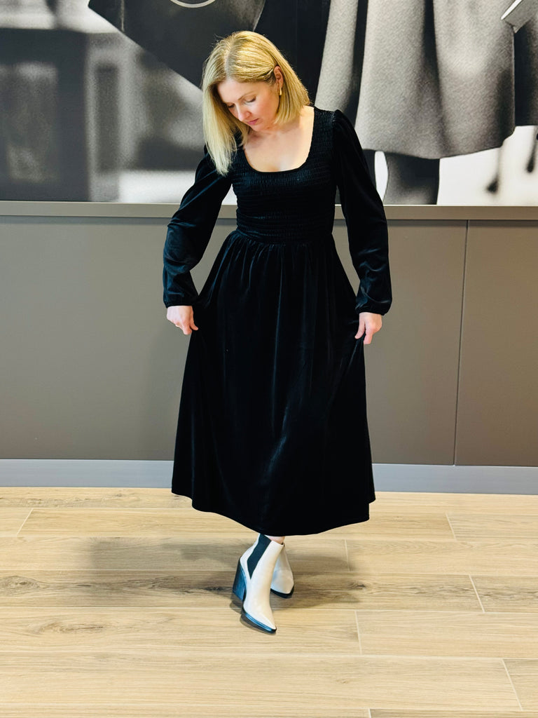 Velvet smocked bodice midi dress with long sleeves and scoop neckline
